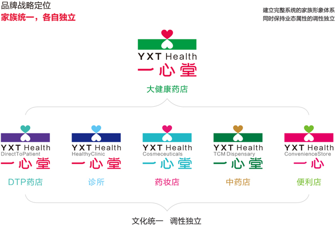 一心堂未來是要構(gòu)建多業(yè)態(tài)大健康產(chǎn)業(yè)鏈的,集團旗下會有很多業(yè)態(tài),那么怎么才能先通過品牌外在形象實現(xiàn)一開始定下的“家族統(tǒng)一,業(yè)態(tài)獨立”的品牌戰(zhàn)略定位呢?