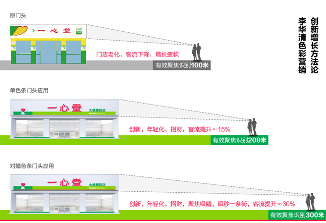 經(jīng)過我們李華清研究小組的測算分析,如果一心堂原來的門頭只能讓人在百米開外看到,那么加了色條的門頭就能夠在200米內(nèi)引導(dǎo)人們的視線;而將綠色條下再襯以高反差的紅色,就能夠在300米內(nèi)視線聚焦。讓整條街道都能看到一心堂,實現(xiàn)焦點引流。
